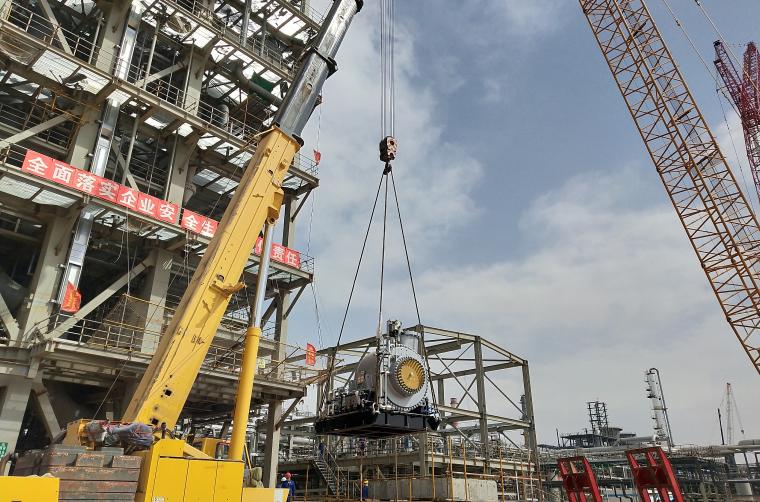 榆能化聚烯烃项目部相关负责人介绍,PP3装置主反应器循环气压缩机是该装置大力推进复工复产、疫情防控以来进行的首台大型设备吊装。吊装前,相关单位通力配合,精心谋划,提前搭设脚手架作业平台等,有效减少了高处作业,大大降低了设备安装风险。