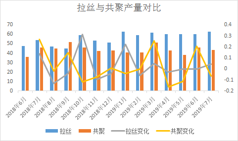拉丝价格走高除受期货拉涨以外,粉料价格高位仍在支撑粒料价格高位不下的原因,装置排产来看,部分停车装置再现利好,新投产装置量产偏少,拉丝体量较大,且多为快消品,刚需存在。
