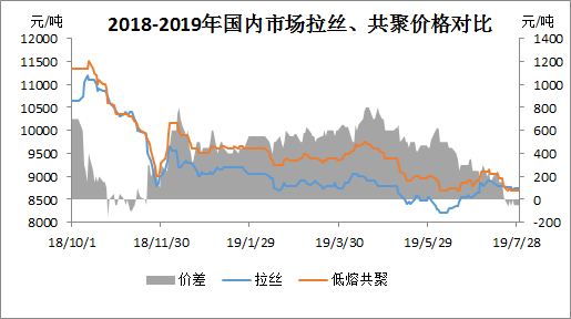 进入7月份以来,随着PP期货的大幅拉涨,作为标品的PP拉丝跟涨迅速,作为非标品的共聚,涨幅跟进较为缓慢,国内聚丙烯现货市场拉丝与共聚市场价格出现平水的现象,从2016年至今拉丝与共聚平水的现象仅出现过两次,目前已经进入倒挂态势,拉丝价格高出共聚300元/吨之多。