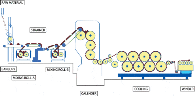 是指将热塑性树脂加热到粘流温度成为熔融体,通过两个以上的平行异向旋转辊筒间隙,使熔体受到辊筒挤压延展、拉伸作用而成为具有一定规格尺寸和符合质量要求的连续片状制品,自然冷却后成型。