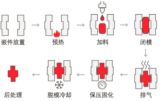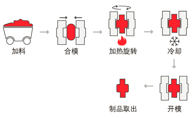 主要用于热固性塑料制品的生产。成型经过加热使其熔化,加压冲模,再经过加热交联固化,脱模后既得制品。