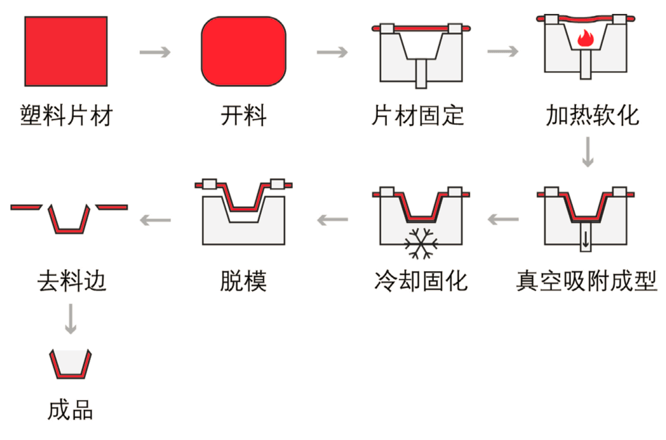一种塑料加工工艺,主要原理是将平展的塑料硬片材加热变软后,采用真空吸附于模具表面,冷却后成型,并应用于各行各业的一种技术工艺。