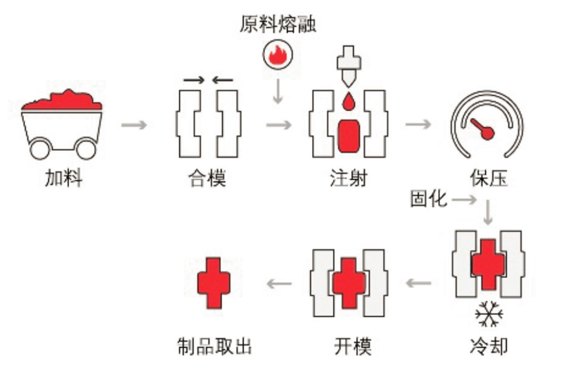 3.在柱塞或螺杆的加压下物料被压缩并向前移动,通过机筒前的射嘴以很快的速度注入较低温度的闭合模腔内;