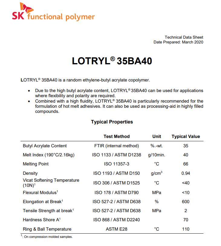 - 阿科玛增韧剂相容剂EBA Lotryl 35BA40 物性表, 阿科玛增韧剂相容剂EBA Lotryl 35BA40 产品参数,阿科玛增韧剂相容剂EBA Lotryl 35BA40 性能表,阿科玛增韧剂相容剂EBA Lotryl 35BA40 出厂报告, MSDS,, 物质安全资料表, UL黄卡,{ SGS报告, RoHS, 食品级认证, NSF饮用水标准, 产品资料, 产品性能, 出厂报告, 原厂原包, 代理商, 热变形温度, 熔指数, 流动系数, 抗冲击性能、冲击强度, 低温韧性、低温抗冲击性能, 熔体流动系数、熔体流动速率, 加工工艺、加工参数、加工温度, 欧盟RoHS 德国FDA 美国FDA 日本FDA