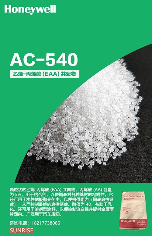 霍尼韦尔A-C 540A为粉末状的乙烯-丙烯酸 (EAA) 共聚物,丙烯酸 (AA) 含量为 5%,用于粘合剂,以便提高对各种基材的粘附性。霍尼韦尔PE蜡A-C 540A还可用于水性地板抛光剂中,以便提供阻力(提高磨擦系数)。霍尼韦尔PE蜡A-C 540A酸值为40,有助于乳化。还可用于溶剂型涂料,以便控制流变性并提供金属薄片定向。广泛用于汽车底漆。霍尼韦尔PE蜡A-C 540A还可用于色母粒和工程树脂的分散剂。