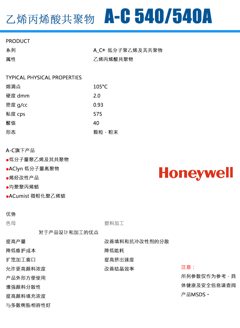 - Honeywell霍尼韦尔 A C 540 蜡粉蜡乳液 物性表, Honeywell霍尼韦尔 A C 540 蜡粉蜡乳液 产品参数,Honeywell霍尼韦尔 A C 540 蜡粉蜡乳液 性能表,Honeywell霍尼韦尔 A C 540 蜡粉蜡乳液 出厂报告, MSDS,, 物质安全资料表, UL黄卡,{ SGS报告, RoHS, 食品级认证, NSF饮用水标准, 产品资料, 产品性能, 出厂报告, 原厂原包, 代理商, 热变形温度, 熔指数, 流动系数, 抗冲击性能、冲击强度, 低温韧性、低温抗冲击性能, 熔体流动系数、熔体流动速率, 加工工艺、加工参数、加工温度, 欧盟RoHS 德国FDA 美国FDA 日本FDA