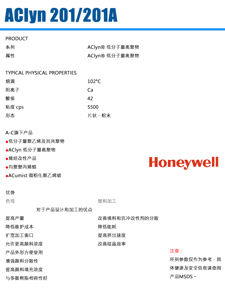 - 霍尼韦尔 AClyn® 201A EAA共聚物的钙离子聚合物 物性表, 霍尼韦尔 AClyn® 201A EAA共聚物的钙离子聚合物 产品参数,霍尼韦尔 AClyn® 201A EAA共聚物的钙离子聚合物 性能表,霍尼韦尔 AClyn® 201A EAA共聚物的钙离子聚合物 出厂报告, MSDS,, 物质安全资料表, UL黄卡,{ SGS报告, RoHS, 食品级认证, NSF饮用水标准, 产品资料, 产品性能, 出厂报告, 原厂原包, 代理商, 热变形温度, 熔指数, 流动系数, 抗冲击性能、冲击强度, 低温韧性、低温抗冲击性能, 熔体流动系数、熔体流动速率, 加工工艺、加工参数、加工温度, 欧盟RoHS 德国FDA 美国FDA 日本FDA