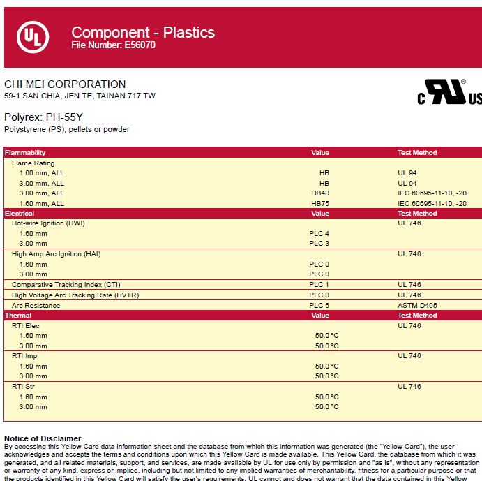 Min. Thick. 试片最小厚度 单位为mm。在上述黄卡中,试片厚度为3mm时,难燃性为5VA。试片厚度为1mm时,难燃性为5VB。