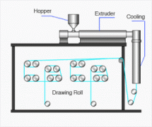 单丝 通过挤出机将高分子树脂挤出细丝(如同从面条机中挤出面条一样)形状后进行冷却,再拉伸成细丝以增强细丝强度的成型方法。 单...