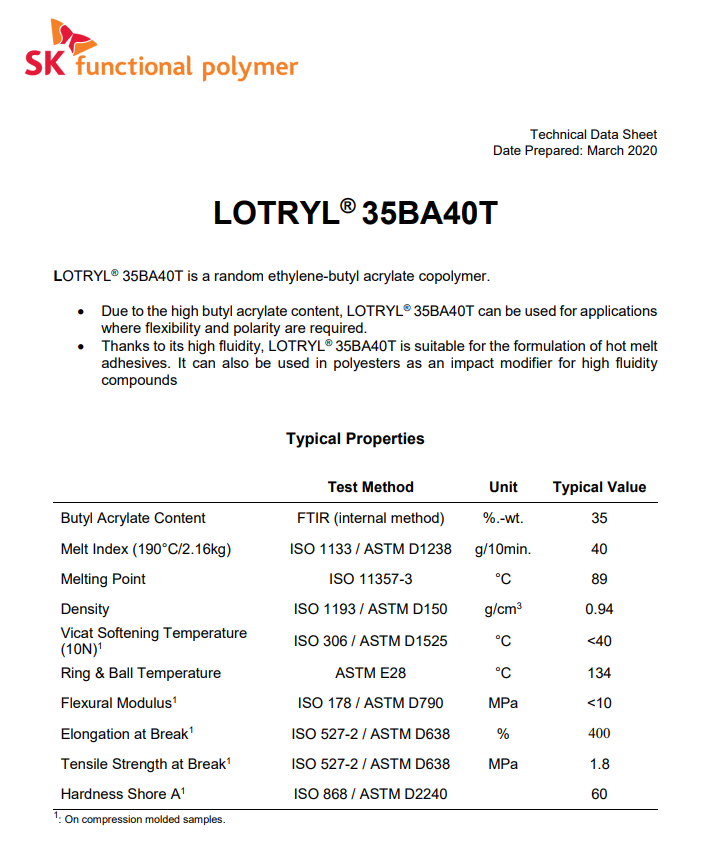 • EBA 法国阿科玛 35BA40T 物性表, EBA 法国阿科玛 35BA40T 产品参数,EBA 法国阿科玛 35BA40T 性能表,EBA 法国阿科玛 35BA40T 出厂报告, MSDS,, 物质安全资料表, UL黄卡,{ SGS报告, RoHS, 食品级认证, NSF饮用水标准, 产品资料, 产品性能, 出厂报告, 原厂原包, 代理商, 热变形温度, 熔指数, 流动系数, 抗冲击性能、冲击强度, 低温韧性、低温抗冲击性能, 熔体流动系数、熔体流动速率, 加工工艺、加工参数、加工温度, 欧盟RoHS 德国FDA 美国FDA 日本FDA
