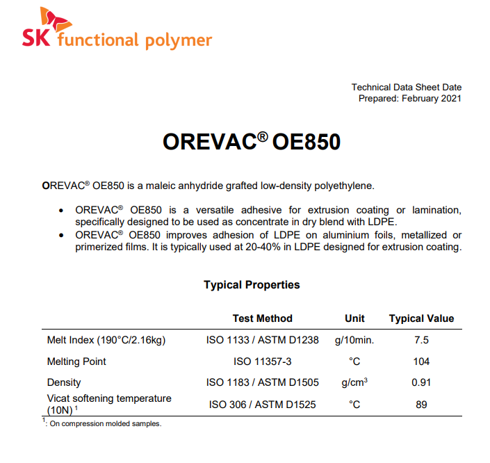 - 阿科玛Orevac® OE850粘结树脂粘结树脂 物性表, 阿科玛Orevac® OE850粘结树脂粘结树脂 产品参数,阿科玛Orevac® OE850粘结树脂粘结树脂 性能表,阿科玛Orevac® OE850粘结树脂粘结树脂 出厂报告, MSDS,, 物质安全资料表, UL黄卡,{ SGS报告, RoHS, 食品级认证, NSF饮用水标准, 产品资料, 产品性能, 出厂报告, 原厂原包, 代理商, 热变形温度, 熔指数, 流动系数, 抗冲击性能、冲击强度, 低温韧性、低温抗冲击性能, 熔体流动系数、熔体流动速率, 加工工艺、加工参数、加工温度, 欧盟RoHS 德国FDA 美国FDA 日本FDA