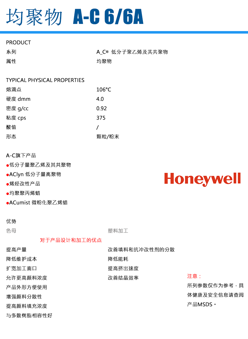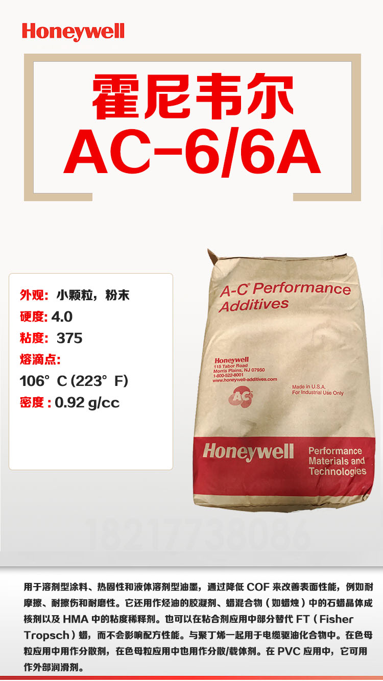 - 美国霍尼韦尔 HONEYWELL AC-6A 低分子聚乙烯蜡 物性表, 美国霍尼韦尔 HONEYWELL AC-6A 低分子聚乙烯蜡 产品参数,美国霍尼韦尔 HONEYWELL AC-6A 低分子聚乙烯蜡 性能表,美国霍尼韦尔 HONEYWELL AC-6A 低分子聚乙烯蜡 出厂报告, MSDS,, 物质安全资料表, UL黄卡,{ SGS报告, RoHS, 食品级认证, NSF饮用水标准, 产品资料, 产品性能, 出厂报告, 原厂原包, 代理商, 热变形温度, 熔指数, 流动系数, 抗冲击性能、冲击强度, 低温韧性、低温抗冲击性能, 熔体流动系数、熔体流动速率, 加工工艺、加工参数、加工温度, 欧盟RoHS 德国FDA 美国FDA 日本FDA